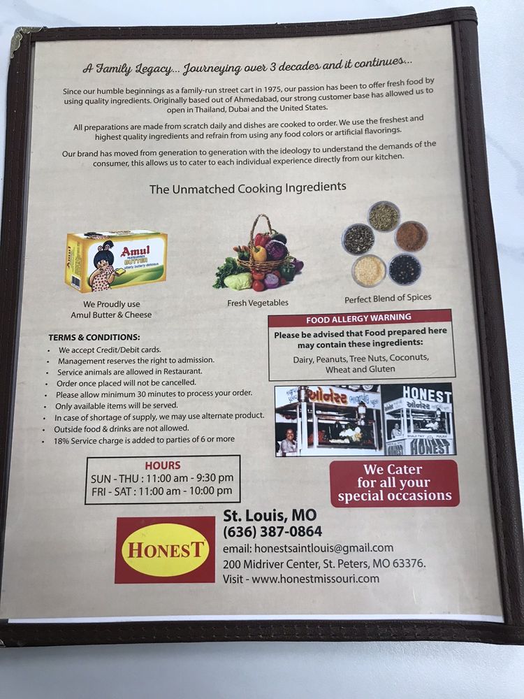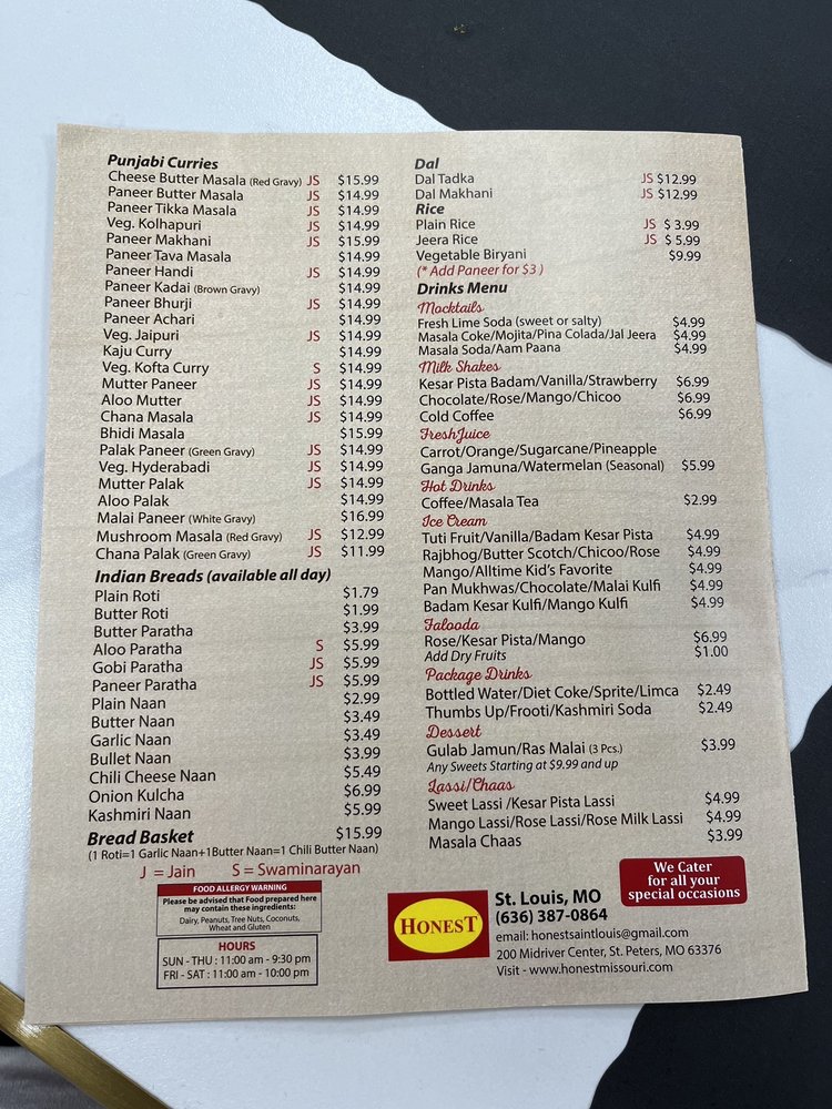 Looking for a delightful vegetarian dining experience that includes tantalizing Indian flavors and innovative sandwich creations? Look no further than Honest Restaurant located at 200 Mid Rivers Centre St. Peters, MO. This restaurant offers delivery and takeout options, as well as outdoor seating for those who prefer dining al fresco. What sets Honest Restaurant apart is their commitment to sustainability, providing reusable tableware and allowing dogs on their premises. The menu at Honest Restaurant is a fusion of traditional Indian dishes and creative sandwich options, catering to a variety of tastes. From spicy curries to mouth-watering sandwiches, each dish is crafted with passion and expertise. Honest Restaurant is a must-visit destination for those seeking flavorful and environmentally-conscious dining experiences.